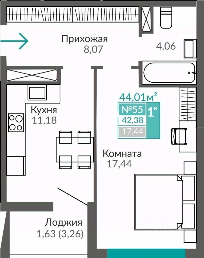 Продаётся 1-комнатная квартира в строящемся доме (С7), срок сдачи: III-кв. 2027, общей площадью 42.38 кв.м., на 6 этаже. Жилой квартал "Абрикос" - начало яркой истории жизни в прогрессивном районе Симферополя - Семья городских кварталов "Крымская Роза".