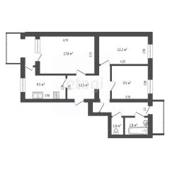 Комнаты изолированные: 12м2, 9м2, 16м2, кухня 9м2. Санузел раздельный.