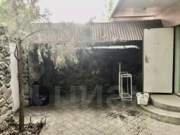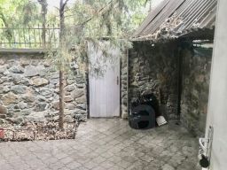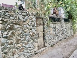 Дворик огорожен каменным забором, накрыт навесом из поликарбоната