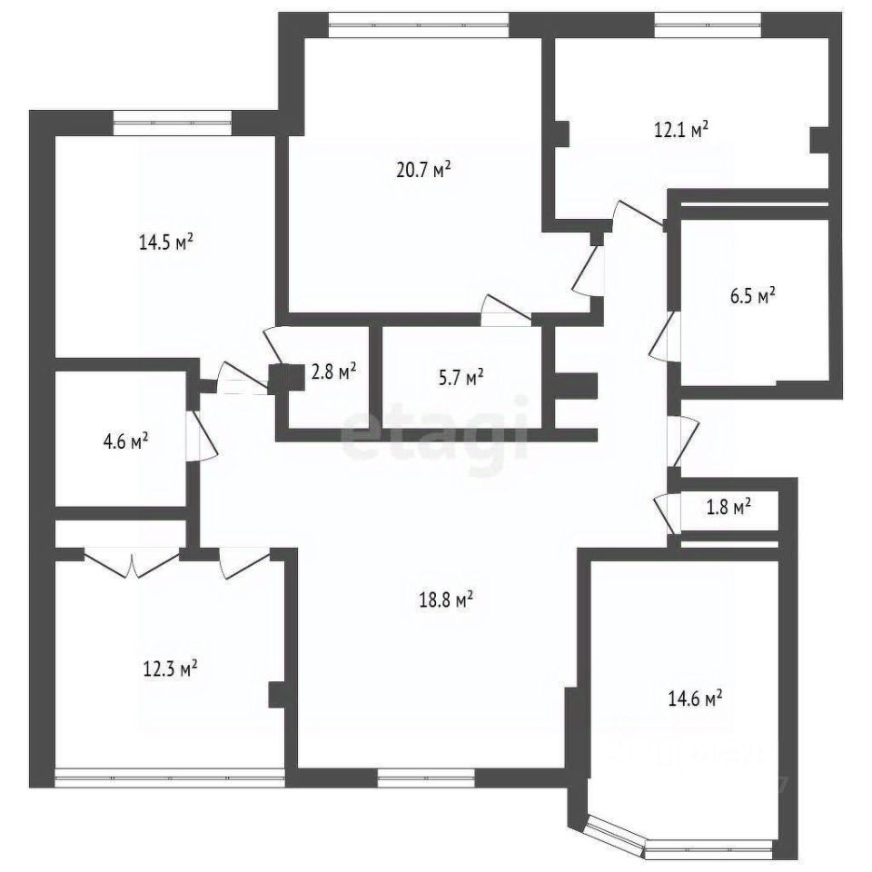 Объект отличается рациональной планировкой, включающей изолированные зоны: три спальни, кабинет, две гардеробные и два совмещенных санузла.