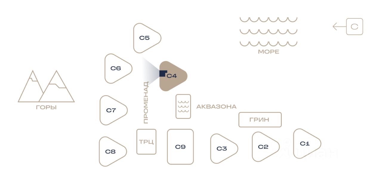 Здания оригинальной треугольной формы обеспечивают равномерное наполнение каждых апартаментов солнечным светом. Точно выверенный угол поворота корпусов позволяет любоваться завораживающими панорамами Крыма.