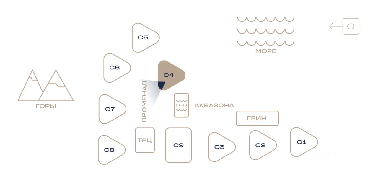 Здания оригинальной треугольной формы обеспечивают равномерное наполнение каждых апартаментов солнечным светом. Точно выверенный угол поворота корпусов позволяет любоваться завораживающими панорамами Крыма.
