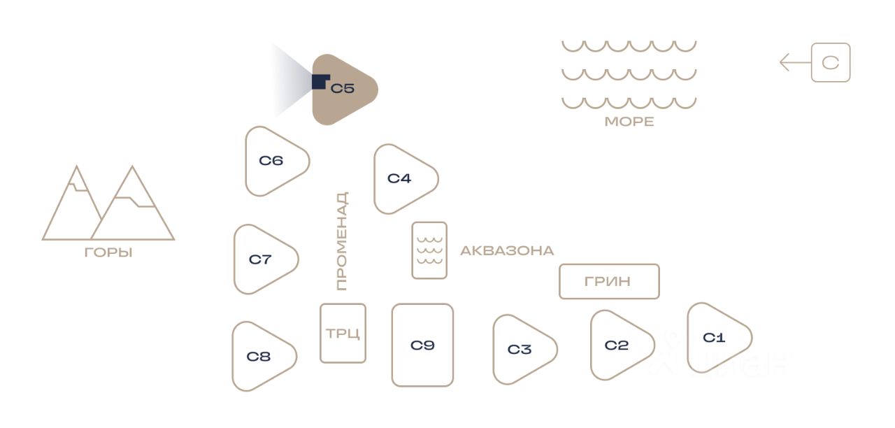 Здания оригинальной треугольной формы обеспечивают равномерное наполнение каждых апартаментов солнечным светом. Точно выверенный угол поворота корпусов позволяет любоваться завораживающими панорамами Крыма.