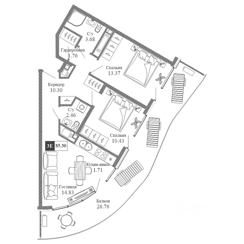 Здания оригинальной треугольной формы обеспечивают равномерное наполнение каждых апартаментов солнечным светом. Точно выверенный угол поворота корпусов позволяет любоваться завораживающими панорамами Крыма.
