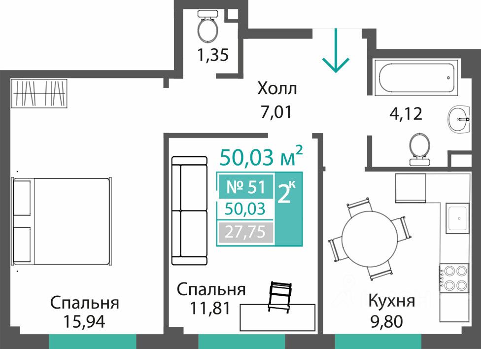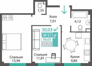 Продаётся 2-комнатная квартира в строящемся доме (ЭТАП 1, СЕКЦИИ А1, А2, А3), срок сдачи: III-кв. 2028, общей площадью 50.03 кв.м., на 1 этаже. Новый жилой комплекс "Семейный квартал ПРОПОЛИС" от застройщика "Монолит" расположен по адресу: Республика Крым, Симферопольский район, с. Мирное, ул. Учительская
