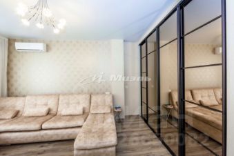 - Комната: удобный диван, шкаф-купе, люстра, шторы.