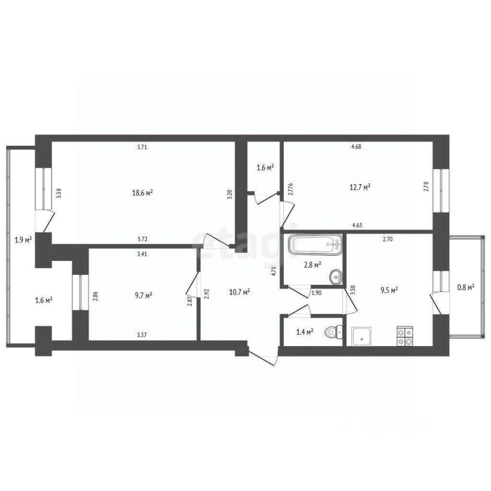 Площадь комнат 9,7 кв.м.; 18,6 кв.м.; 12,7 кв.м. ; кухня 9,5 кв.м, высота потолков 2,6 м.