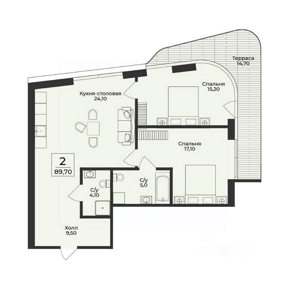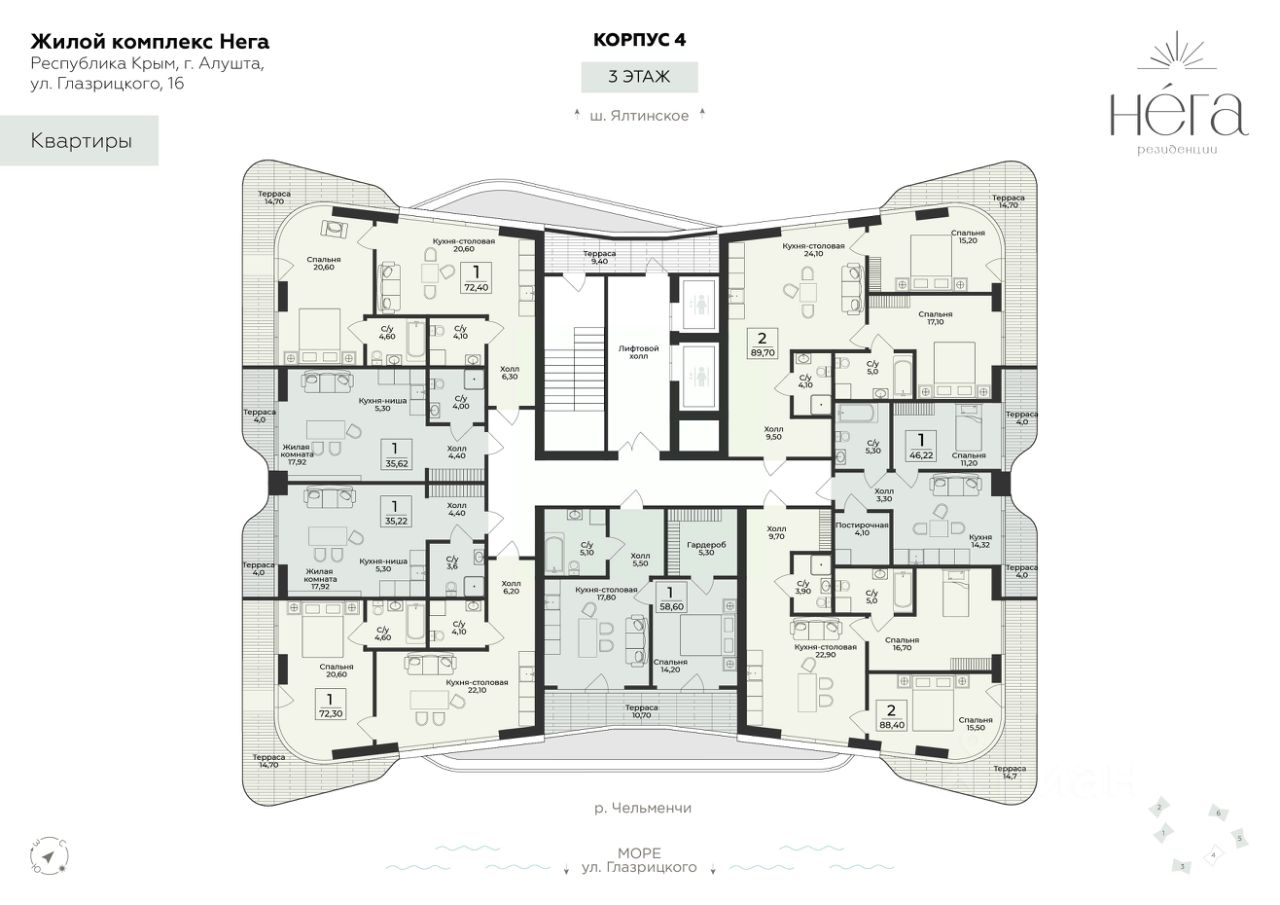 Продаётся 2-комнатная квартира в строящемся доме (Корпус 4), срок сдачи: III-кв. 2028, общей площадью 89.7 кв.м., на 3 этаже. Премиальный жилой комплекс "Нега" возводится в Профессорском уголке неподалёку от набережной, где снимался фильм "Кавказская пленница".