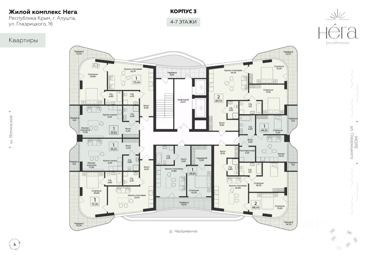 Продаётся 2-комнатная квартира в строящемся доме (Корпус 3), срок сдачи: III-кв. 2028, общей площадью 88.4 кв.м., на 5 этаже. Премиальный жилой комплекс "Нега" возводится в Профессорском уголке неподалёку от набережной, где снимался фильм "Кавказская пленница".
