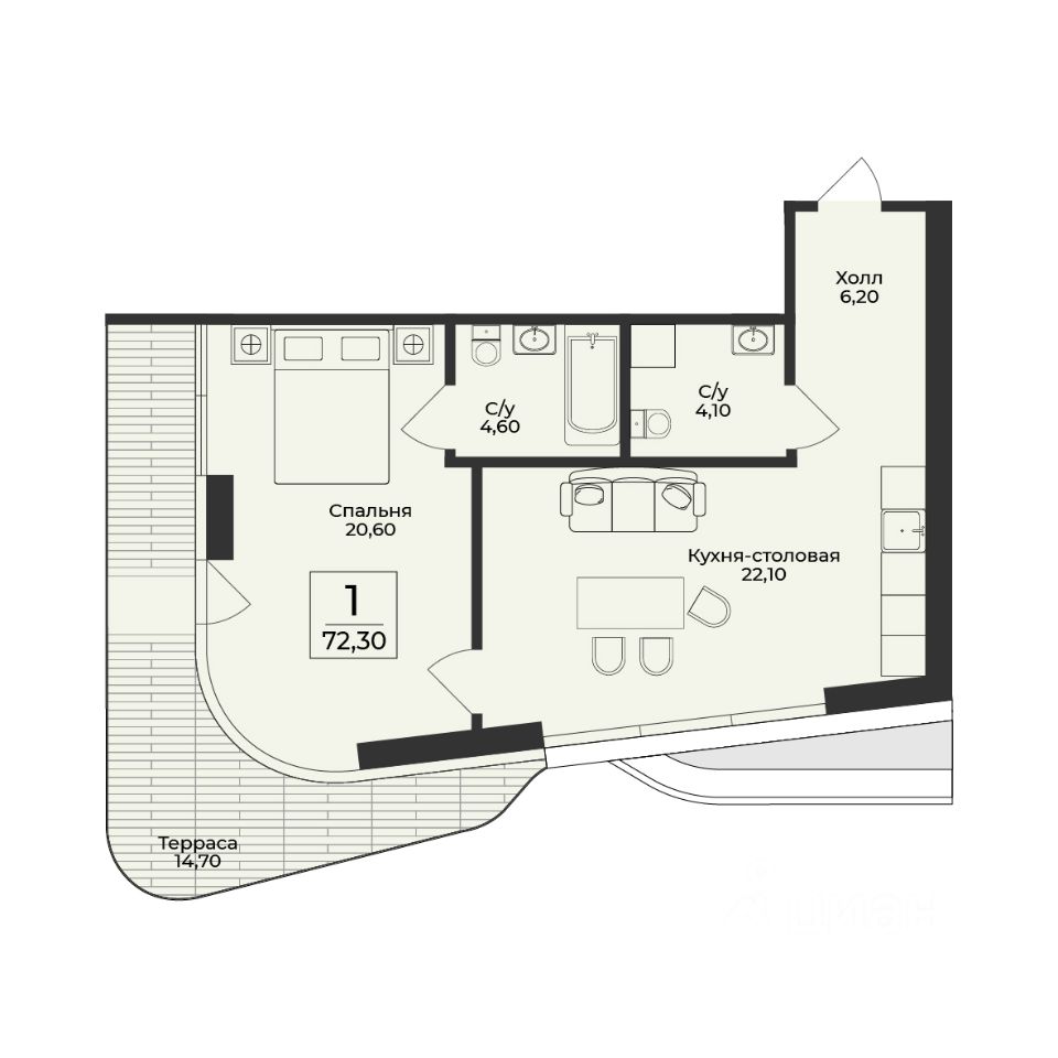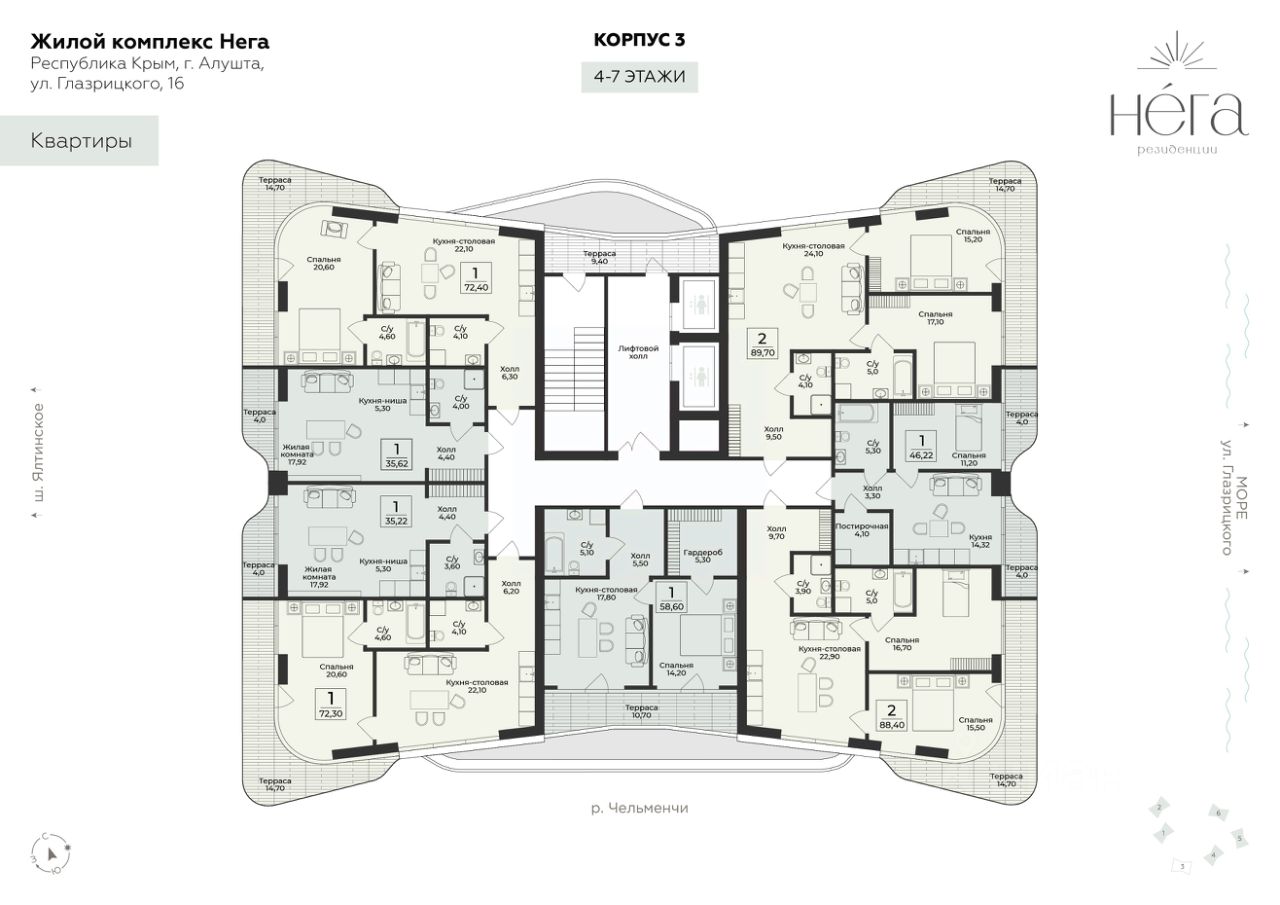Продаётся 2-комнатная квартира в строящемся доме (Корпус 3), срок сдачи: III-кв. 2028, общей площадью 72.3 кв.м., на 5 этаже. Премиальный жилой комплекс "Нега" возводится в Профессорском уголке неподалёку от набережной, где снимался фильм "Кавказская пленница".