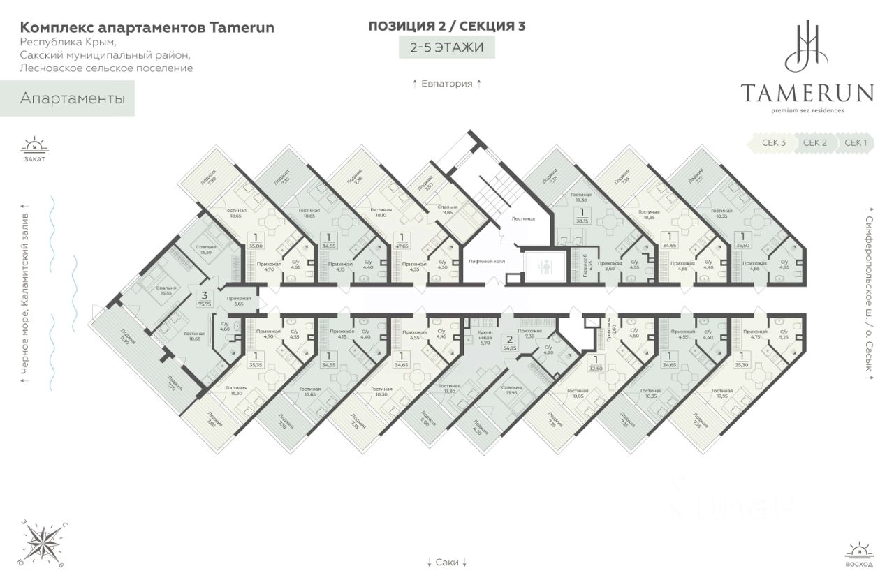Продаются 3-комнатные апартаменты в строящемся доме (Этап 2 (Секции 1-3)), срок сдачи: II-кв. 2029, общей площадью 75.75 кв.м., на 3 этаже. "Tamerun" - морская резиденция на Западном берегу Крыма, между городами Евпатория и Саки.
