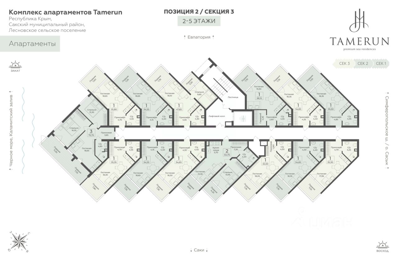 Продаются 2-комнатные апартаменты в строящемся доме (Этап 2 (Секции 1-3)), срок сдачи: II-кв. 2029, общей площадью 54.75 кв.м., на 2 этаже. "Tamerun" - морская резиденция на Западном берегу Крыма, между городами Евпатория и Саки.