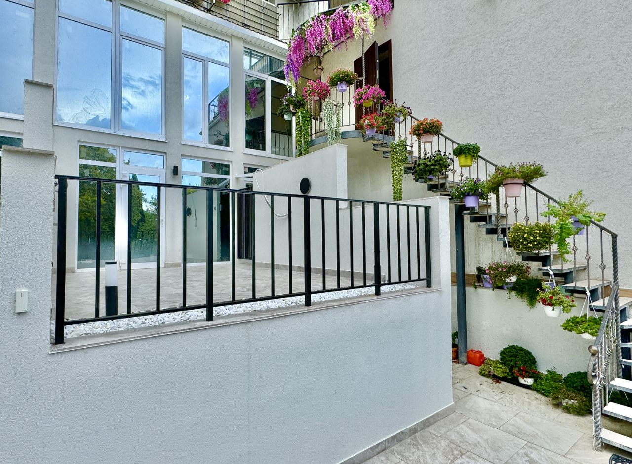 - Панорамные раздвижные окна и двери на обоих уровнях (профиль Elex 58, 3-камерные, зеркальное затемнение).
