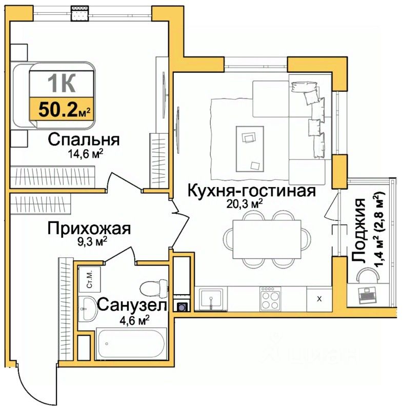 2-комн. квартира с европланировкой и предчистовой отделкой в ЖМ "Город Мира" на 13 этаже. Общая площадь: 50.2 кв.м., жилая: 24.9 кв.м., общая площадь гостиной-столовой с кухонной зоной: 20.3 кв.м. Европланировка, зона гостиной комнаты объединена с кухней. Квартира угловая, очень светлая, естественная вентиляция при открытии окон. В квартире одна лоджия, один совмещенный санузел. Высота потолков 2.7 м.