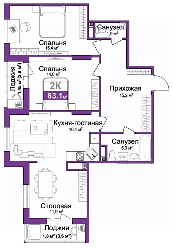 3-комн. квартира с европланировкой и предчистовой отделкой в ЖМ "Город Мира" на 2 этаже. Общая площадь: 83.1 кв.м., жилая: 41.3 кв.м., общая площадь гостиной-столовой с кухонной зоной: 28.3 кв.м. Европланировка, за счет большой площади кухни-гостиной квартира выглядит просторной и очень удобна для жизни. Квартира угловая, окна oбecпeчивaют paвнoмepнoe ocвeщeниe в тeчeниe дня. В квартире один балкон и одна лоджия, один совмещенный и один раздельный санузел. Высота потолков 2.7 м.
