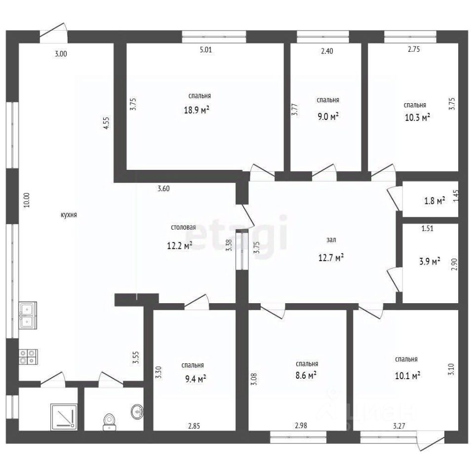 Объект отличается уникальной планировкой, включающей семь комнат: шесть изолированных помещений, зал и огромная кухня 30 кв. м.