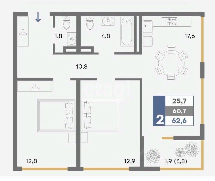 ДВУХКОМНАТНАЯ КВАРТИРА С КУХНЕЙ СТУДИЕЙ 17,6 КВ.М.!