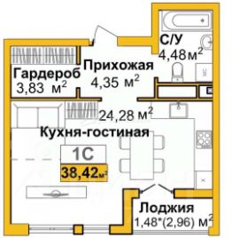 Общая площадь 38.42 кв. м., жилая 18.27 кв. м., кухня 6.01 кв. м., лоджия 1.48 кв. м., гардеробная 3.83 кв. м.