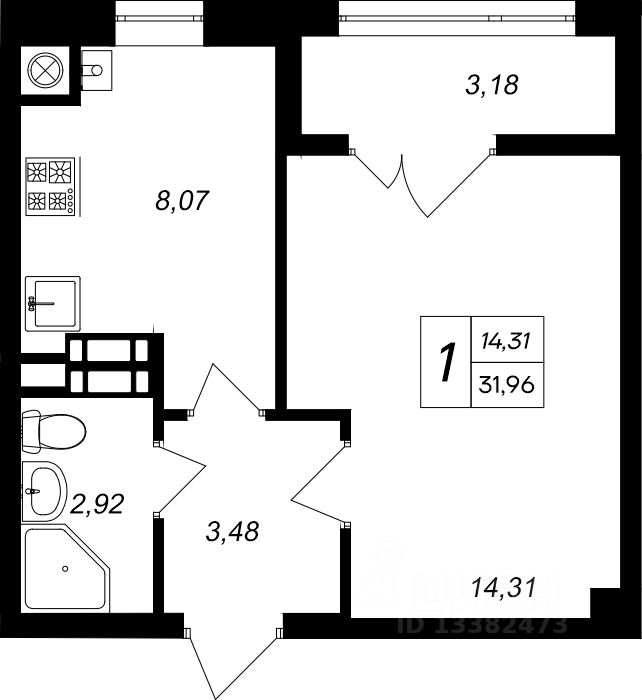 Продаётся 1-комнатная квартира в строящемся доме (Корпус 1), срок сдачи: II-кв. 2027, общей площадью 31.96 кв.м., на 9 этаже. "Парковые кварталы" - новый объект от "ИнтерСтрой"