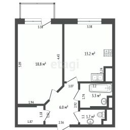 Общая площадь 45.1 кв. м., жилая 18.8 кв. м., кухня 13.2 кв. м. застекленный балкон, раздельный санузел.