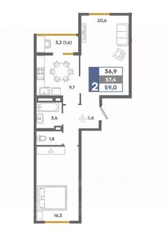 В продаже 2-х комнатная квартира, которая состоит из кухни 9,7 м2, комнат 20,6 и 16,3 м2, санузла 3,4 и 1,8 м2, прихожей 5,6 м2 и лоджии. Общая площадь 59,0 м2.