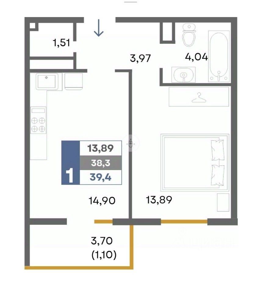 В продаже 1-но комнатная квартира, которая состоит из кухни-гостиной 14,9 м2, комнаты 13,9 м2, совмещенного санузла 4,0 м2, прихожей 4,0 м2, гардеробной 1,5 м2 и балкона. Общая площадь 39,4 м2.