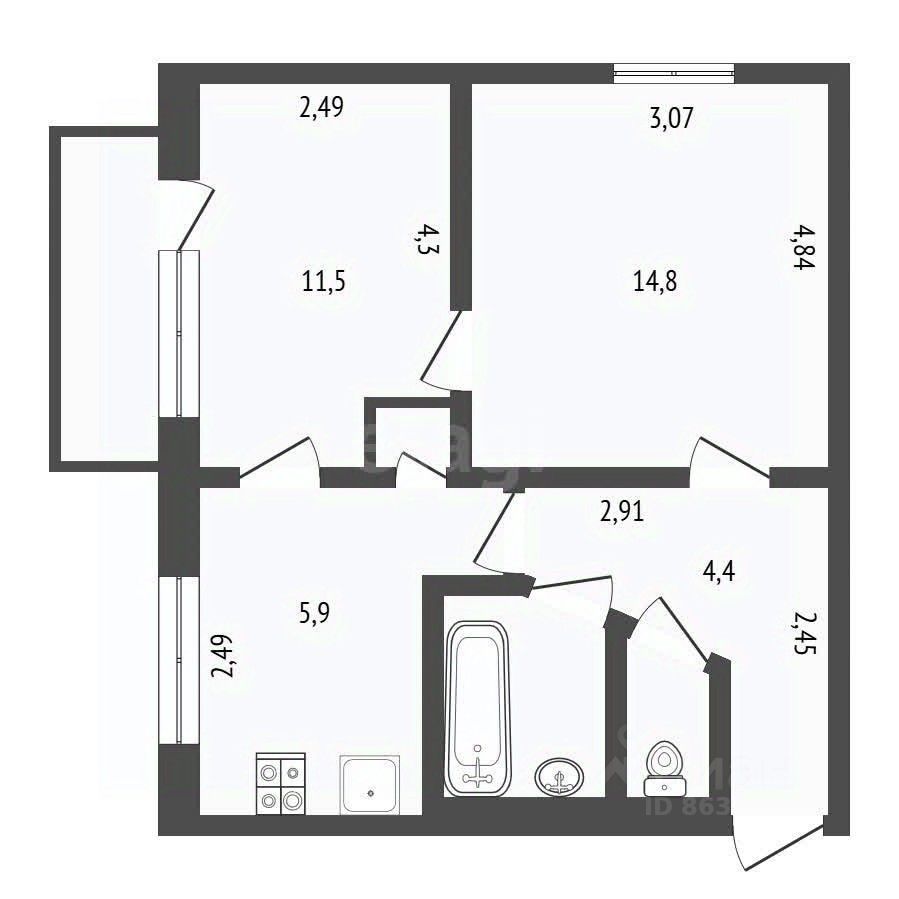 Продаётся двухкомнатная квартира со смежными комнатами,общей площадью 39.5 м.кв . Зал 14.5 м.кв и спальня 11.5 м. Кв .
