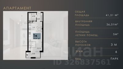 Апартаменты свободной планировки, 41,51 м²