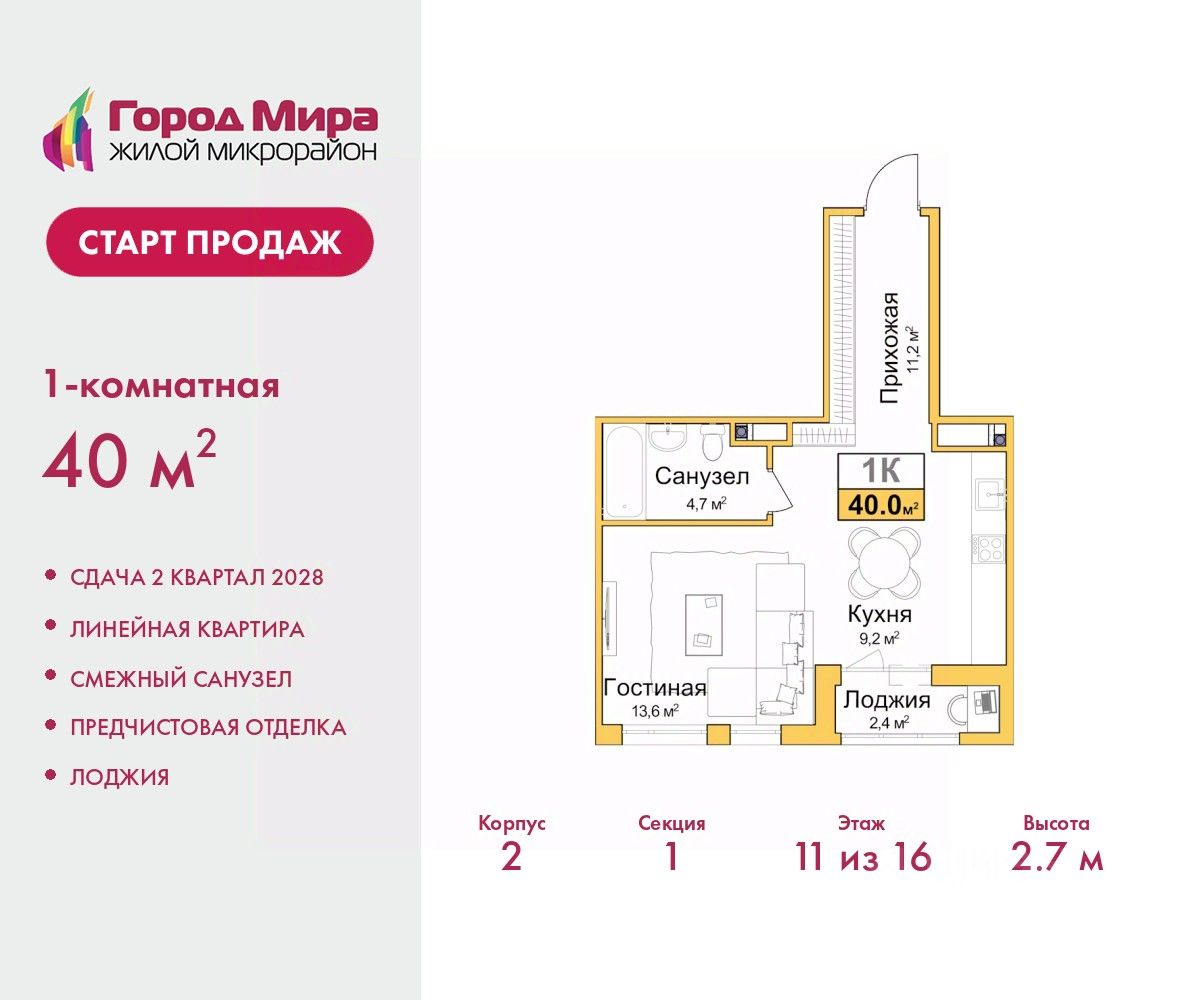 Просторная 1-комн. квартира с предчистовой отделкой в ЖМ "Город Мира" на 11 этаже. Общая площадь: 40 кв.м., жилая: 13.6 кв.м., площадь просторной кухни-столовой: 9.2 кв.м. Все окна выходят на одну сторону. В квартире одна лоджия, один совмещенный санузел. Высота потолков 2.7 м.