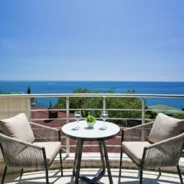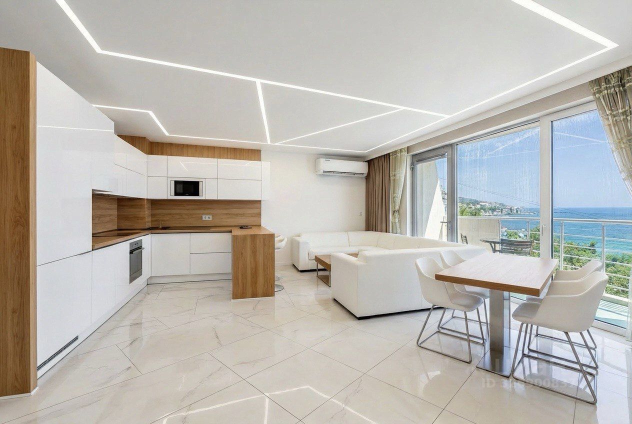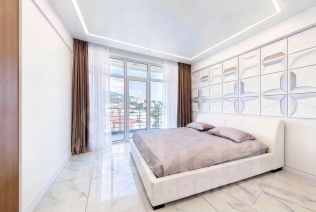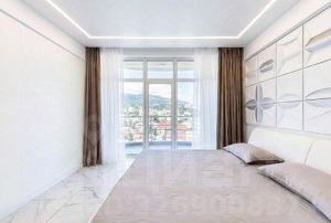 Просторная и светлая однокомнатная квартира с панорамным остеклением. Главная особенность — открывающийся прямой вид на горы и Чёрное море. Никаких соседских балконов или дворов-колодцев, только живописная панорама курорта.