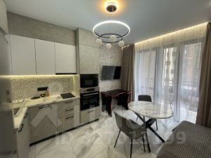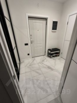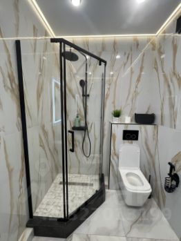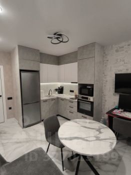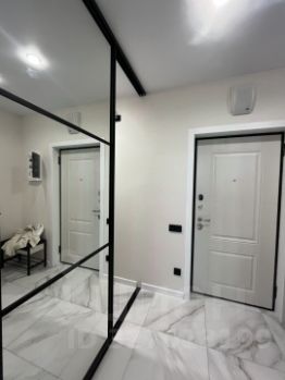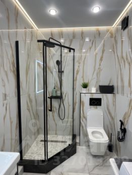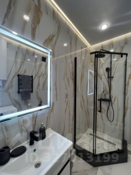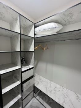 Совмещенный санузел выполнен в стильном мраморном оформлении, оснащен душевой кабиной и качественной сантехникой. В прихожей предусмотрена гардеробная для удобного хранения вещей. На кухне установлена современная мебель и оборудование, включая варочную панель и духовой шкаф.