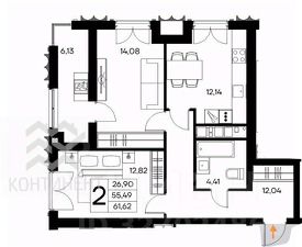 Общая площадь квартиры — 61,62 м². Планировочное решение ориентировано на рациональное использование пространства и комфорт повседневной жизни.