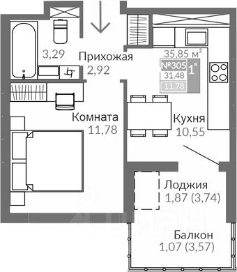 Общая площадь квартиры 35,85 кв.м.