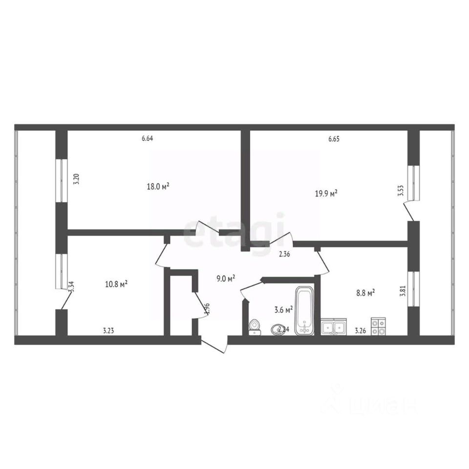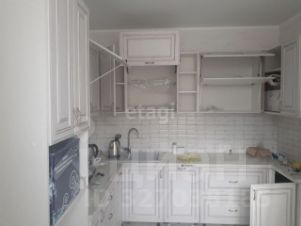 Площадь квартиры составляет 76.5 квадратных метров, жилая площадь - 48.7 квадратных метров. Кухня оформлена на 8.8 квадратных метра. Высота потолков 2.6 метра.