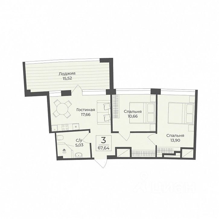 В строящемся апарт-комплексе TAMERUN продаются апартаменты, которые состоят из кухни-гостиной 17,7 кв.м, двух спален 13,9 и 10,7 кв.м, санузла 5,0 кв.м, коридора 4,8 кв.м и лоджии 15,5 кв.м. Общая площадь 67,6 кв.м.