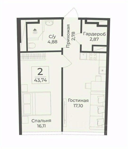 В строящемся апарт-комплексе TAMERUN продаются апартаменты, которые состоят из кухни-гостиной 17,1 кв.м, спальни 16,1 кв.м, санузла 4,9 кв.м, гардеробной 2,8 кв.м, прихожей 2,8 кв.м. Общая площадь 43,7 кв.м.