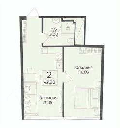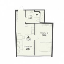 В строящемся апарт-комплексе TAMERUN продаются апартаменты, которые состоят из кухни-гостиной 21,2 м2, спальни 16,8 м2, санузла 5,0 м2. Общая площадь 43,0 м2.