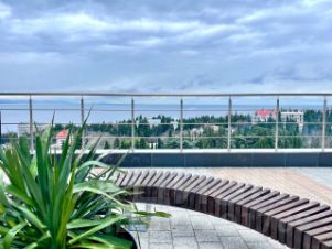 - Расположен в комплексе Крымская Резиденция, Профессорский уголок города Алушта на 15 этаже 16-ти этажного здания.