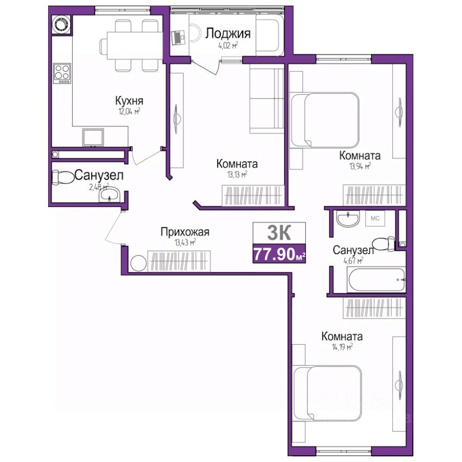 Трехкомнатная квартира от застройщика в ЖМ "Город Мира" на 3 этаже. Общая площадь: 77.9 кв.м. Высота потолков 2.7 м.
