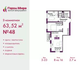 Продается двухкомнатная квартира с предчистовой отделкой в ЖМ "Город Мира" на 8 этаже. Общая площадь: 63.52 кв.м., жилая: 33.89 кв.м., площадь просторной кухни-столовой: 10.69 кв.м. Квартира угловая, окна oбecпeчивaют paвнoмepнoe ocвeщeниe в тeчeниe дня. В квартире одна лоджия, один совмещенный и один раздельный санузел. Высота потолков 2.7 м.