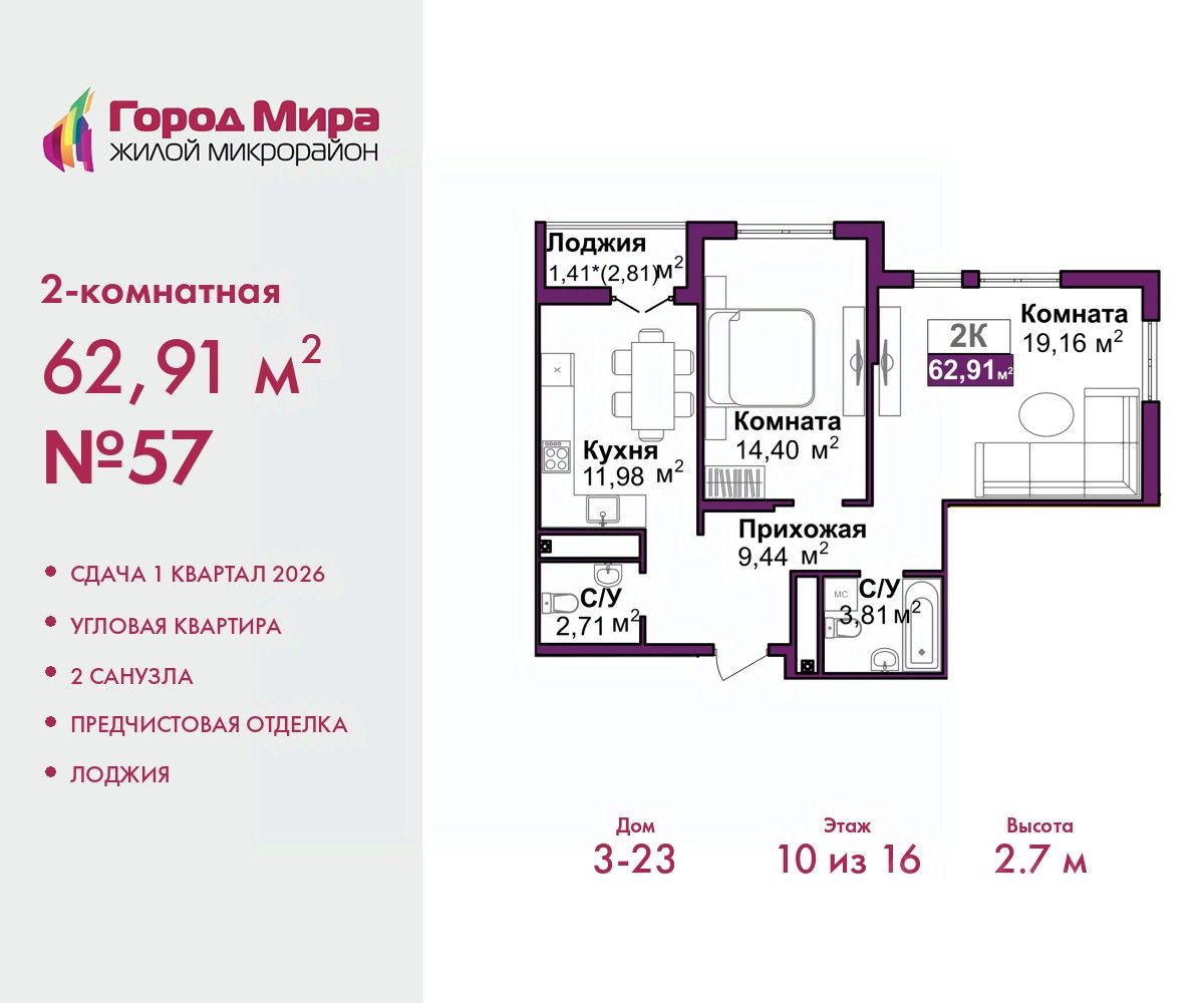Продается двухкомнатная квартира от застройщика с предчистовой отделкой в ЖМ "Город Мира" на 10 этаже. Общая площадь: 62.91 кв.м., жилая: 33.56 кв.м., площадь просторной кухни-столовой: 11.98 кв.м. Угловая квартира, идеально подойдет любителям тишины и панорамных видов. В квартире одна лоджия, один совмещенный и один раздельный санузел. Высота потолков 2.7 м.