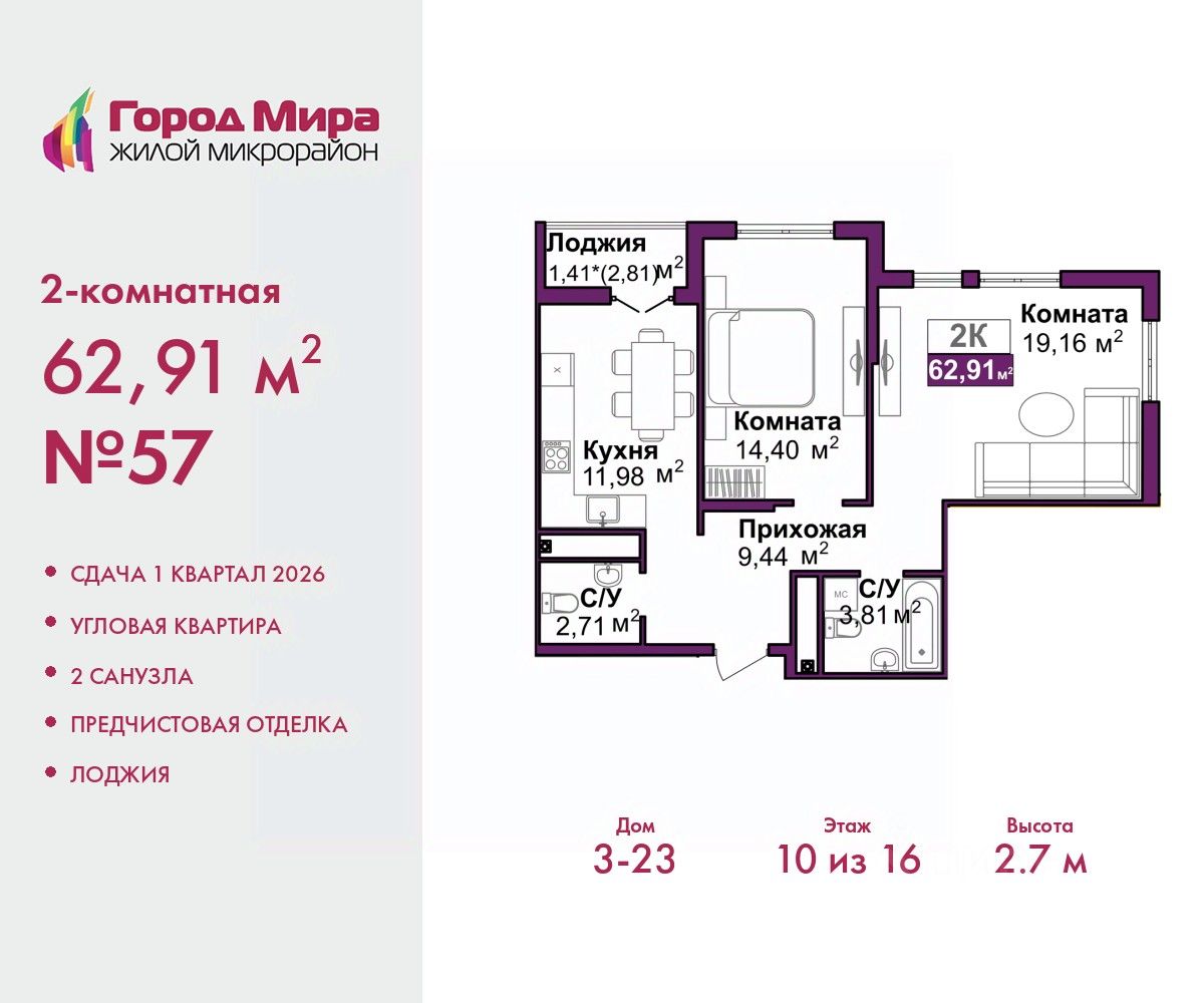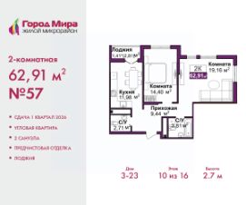 Продается 2-комн. квартира с предчистовой отделкой в ЖМ "Город Мира" на 10 этаже. Общая площадь: 62.91 кв.м., жилая: 33.56 кв.м., площадь просторной кухни-столовой: 11.98 кв.м. Угловая квартира, очень светлая, естественная вентиляция при открытии окон. В квартире одна лоджия, один совмещенный и один раздельный санузел. Высота потолков 2.7 м.