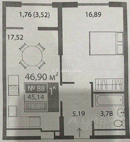 Общая площадь 42.6 кв.м., жилая 16.89 кв.м..