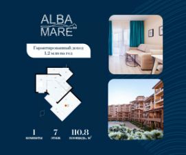 Продаются апартаменты в построенном комплексе. Срок сдачи 4 квартал 2024 года. Альба Дель Маре это комплекс апартаментов бизнес-класса с развитой инфраструктурой. Уютные здания переменной этажности строятся в 5 минутах ходьбы (385 метров) от одного из лучших пляжей Евпатории "Супер Аква Бич". Широкая береговая линия, места для активного отдыха и зоны релакса позволят насладиться отдыхом на любой вкус. Архитектурное решение комплекса создает истинное ощущение Средиземноморья и присутствия на дорогом курорте: скатные черепичные крыши, козырьки и навесы-перголы, арочные завершения проемов, цветовая палитра отделки и фасадов, где используются оттенки желтого, охры, терракоты и бежевого. Переменная этажность здания формирует камерность проекта, создавая прекрасные видовые характеристики для каждого апартамента. Просторные террасы с видом на море, патио с собственным выходом к бассейну на первых этажах комплекса, детская и спортивная площадки, ландшафтный дизайн здесь все создано для роскошного отдыха и расслабления. Территория комплекса апартаментов закрыта и находится под круглосуточным видеонаблюдением, что позволит резидентам и гостям чувствовать безопасность проживания. Концепция комплекса: комфорт проживания с первых дней заселения. Реализация апартаментов осуществляется с полной отделкой под ключ. Собственники апартаментов имеют возможность поручить управление недвижимостью профессиональному оператору, что позволит получать стабильный доход. Автономная газовая котельная позволит не зависеть от внешних отключений отопления., парковочные места на закрытой территории комплекса обеспечат безопасность вашему автомобилю, система центрального кондиционирования создаст комфортную температуру в каждом номере. Жилой комплекс реализуется в соответствии с 214 ФЗ.