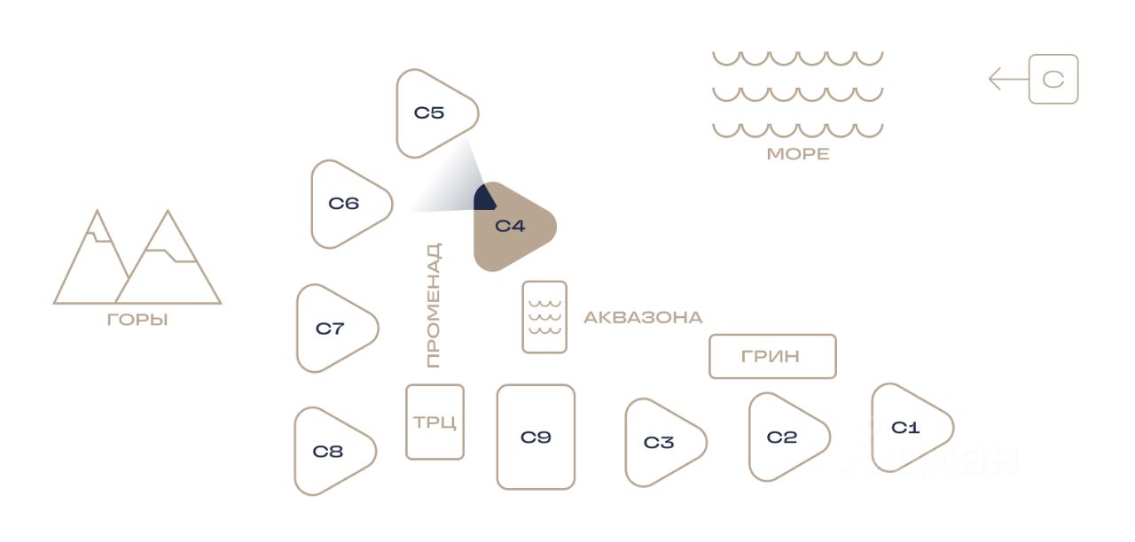 Здания оригинальной треугольной формы обеспечивают равномерное наполнение каждых апартаментов солнечным светом. Точно выверенный угол поворота корпусов позволяет любоваться завораживающими панорамами Крыма.