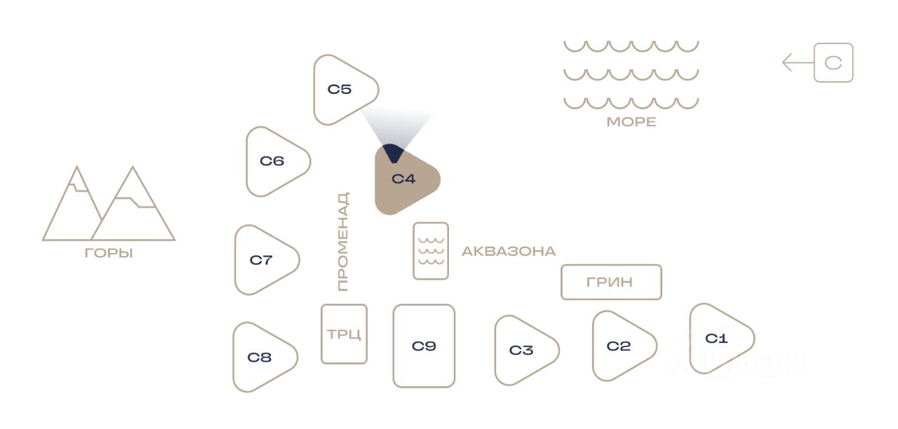 Здания оригинальной треугольной формы обеспечивают равномерное наполнение каждых апартаментов солнечным светом. Точно выверенный угол поворота корпусов позволяет любоваться завораживающими панорамами Крыма.