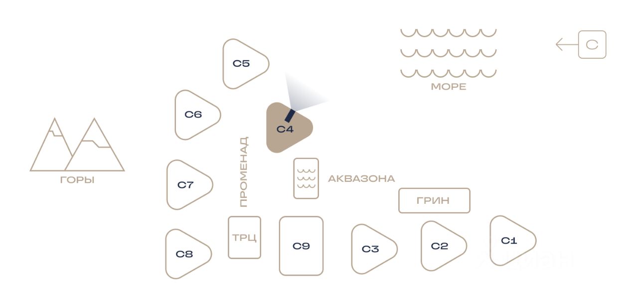 Здания оригинальной треугольной формы обеспечивают равномерное наполнение каждых апартаментов солнечным светом. Точно выверенный угол поворота корпусов позволяет любоваться завораживающими панорамами Крыма.