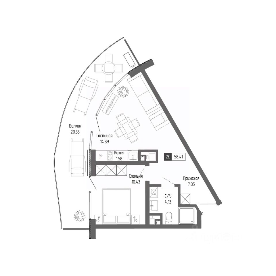 Общая площадь58,41 м²