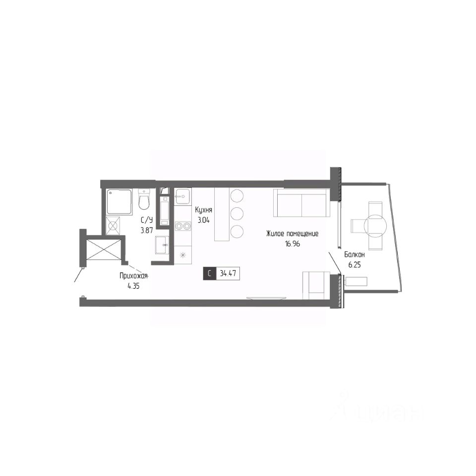 Общая площадь34,47 м²