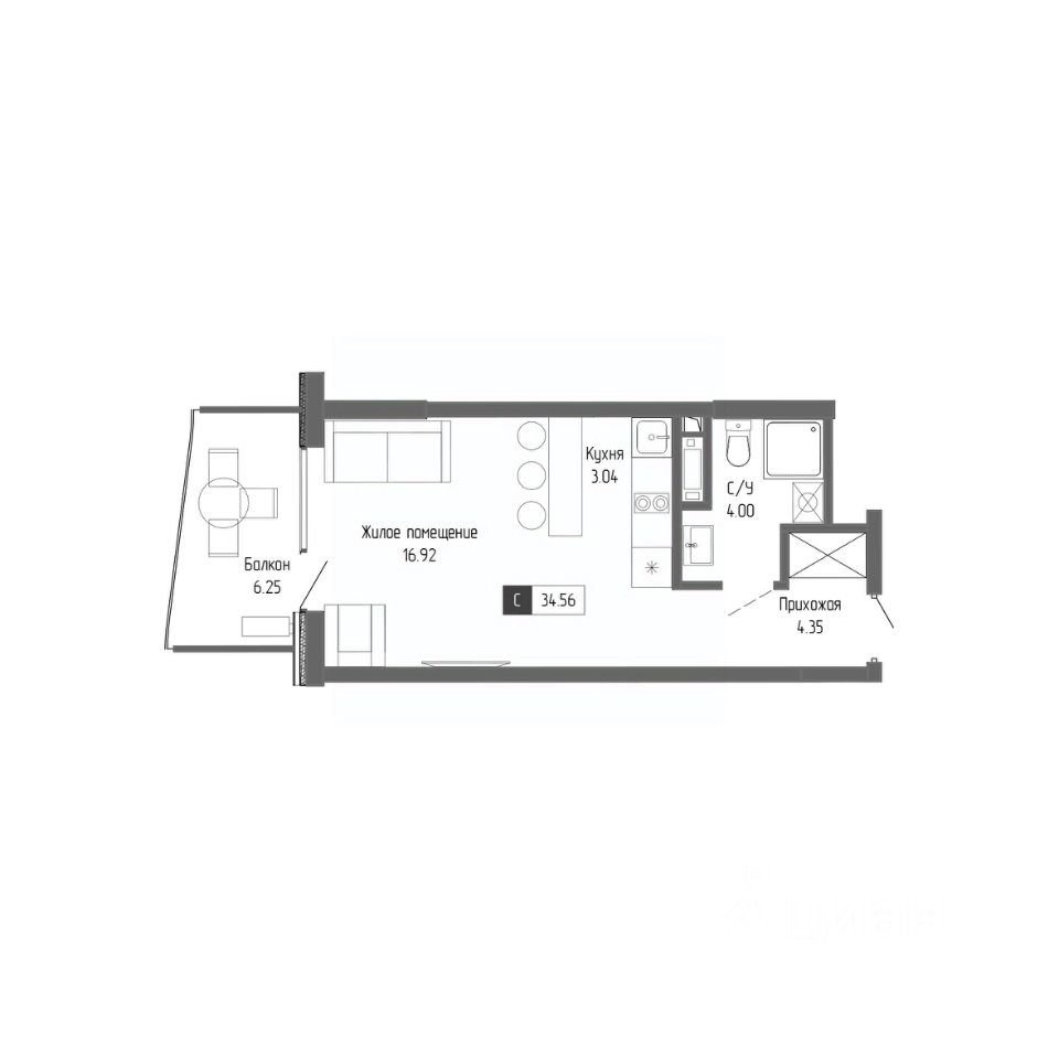 Общая площадь34,56 м²